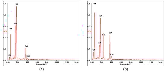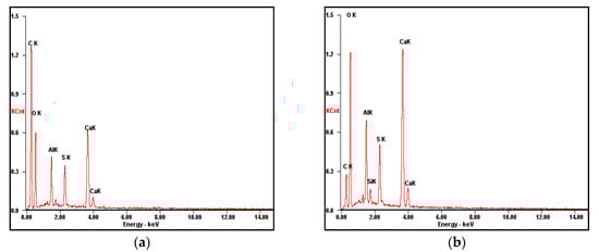 The energy spectrums of slurry from Figure 7a “3” and Figure 7c “4” are given in Figure 8. It can be seen that the four essential elements—Ca, Al, S, and O—of ettringite exist in hardened filling slurry at 30 min. It proves that the needle-like crystals in Figure 7a are ettringite. The formation of ettringite greatly reduces the occurrence of slurry bleeding. The peak values of Al, S, and Ca increase at 1 day (Figure 8b). It is elucidated that the number of hydration products increases significantly after hydrating for 1 day.