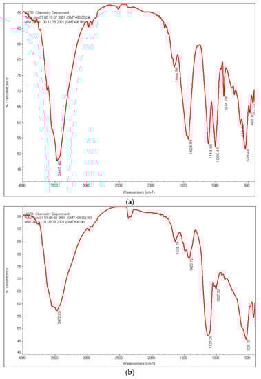 The C–S–H gel is caused by [SiO4] asymmetric stretching vibration of the absorption band located at 970, 658, and 453 cm−1, which is the symbol for identifying C–S–H. It can be seen from Figure 8a that the absorption band of [SiO4] at 970 and 453 cm−1 changes with hydration process, moving to a high wave number. These peaks are more obvious after hydrating for 1 day, indicating that after adding high solidified water additive, there is a certain amount of C–S–H gel in the filling after hydrating for 1 day. However, the absorption peak of C–S–H gel is not found in the infrared spectrum of the hardened filling slurry without special additive after hydrating for 1 day.