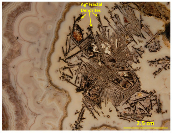 As discussed above, in a simple laboratory experiment utilizing one type of metallic nanoparticles, the fractal dendrites are transitory precursors to the formation of metal crystals as metal nanoparticles, and perhaps atoms infill the spaces between dendrite branches, resulting in the eventual destruction of textural evidence of the aggregation process. However, in the epithermal ores, silica (opal) nanoparticles commonly infill the metal branches of the fractal dendrites, and thus aid in the preservation of evidence of the self-assembly process [34,35]. The term dendrite can have multiple meanings in the science literature. For example, manganese oxyhydroxide minerals can form 2-dimensional fractal dendrites along planar surfaces, or native gold and silver can make 3-dimensional planar dendritic crystals exhibiting a reticulate shape that is controlled by their crystal structures [36]. Those crystal forms differ from the 3-diemnsional fractal dendrites formed by self-assembly, which is demonstrated in Figure 2 in a sample of silver-rich ore from Creede, Colorado. In that sample, coarse-grained (1–5 cm) reticulate “blades” of native silver formed initially, and then they were subsequently encrusted by self-organized fractal dendrites of native silver. Also, note the matrix for both types of dendrites is opaline silica (formed by silica-colloid deposition), which as discussed above, aids in the preservation of evidence of the nanoparticle aggregation process. The formation of opal as opposed to quartz or chalcedony is additional evidence of the far-from-equilibrium chemical conditions during bonanza ore formation [12]. Fractal dendrites formed by nanoparticle aggregation in bonanza epithermal ores were first recognized for electrum [12], then Ag-Se-S phases [35,36], and more recently chalcopyrite [37,49]. Finally, other textural features of bonanza ores have added further insights about the potential physical transport and also deposition of metallic nanoparticles [36].