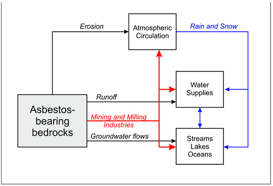 Flowchart illustrating physical/mechanical processes producing asbestos fibres distribution in the environments (modified after [3,11]).