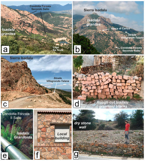 The Isadalu Hbl-bearing granites in anthropic environment: (a) penstocks, Sa Teula artificial basin and watermills of the Secondo Salto hydroelectric plants; (b) eastern view of Sierra Isadalu with localization of the main infrastructures; (c) the collapsing regional Villagrande Strisaili-Talana road, built over Isadalu granites; (d) Isadalu Hbl-bearing granitoid as geomaterial: rough cut blocks used for local buildings; (e) the penstocks and their relationship with Isadalu granitoids; (f,g) Isadalu granitoid blocks used for houses and dry stone walls.