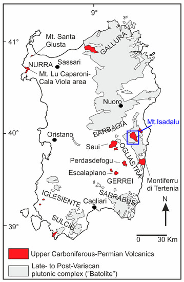 Simplified geological map of Sardinia showing the location of upper Paleozoic magmatic rocks of “Sardinia Batholith” and “Permian volcanic cycle” (modified after [38]). The blue rectangle indicates the Isadalu magmatic complex.