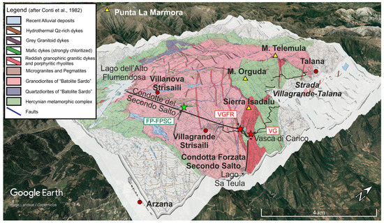 - Conti, L.; Maccioni, L.; Pili, P. Sardegna Scala 1:25.000—Carta Geopetrografica dell'alto Flumendosa (Villanova Strisaili); Istituto di Mineralogia e Petrografia, Università di Cagliari; Istituto di Petrografia, Università di Roma—col.-S.E.L.C.A.: Firenze, Italy, 1981; Nº inv. 800; Available online: http://www.geologi.sardegna.it/documenti/cartografia-geologica/ (accessed on 6 October 2018). (In Italian)