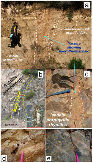 Field photographs of veins and hydrothermal fractures in Isadalu magmatic complex: (a) major fracture showing hydrothermal halo cutting metric Isadalu granitoid dyke; (b) mafic dyke cut by late Qz-vein, in the red rectangle a close-up field photograph; (c) fracture with hydrothermal halo in Isadalu porphyritic rhyolites; (d) late Qz-vein cutting the Isadalu granitoid body; (e) Ep + Chl veins with associated alteration halo, cutting the Isadalu porphyritic rhyolites.