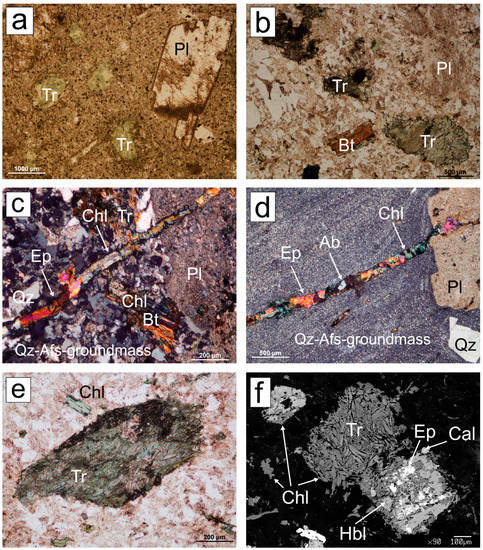 Thin section and back-scattered electron (BSE) images of the Isadalu magmatic rocks: (a) albitized plagioclase and hornblende with pseudomorph textures in mafic oligophyric dykes; (b) albitized plagioclase, chloritized biotite and hornblende with pseudomorph texture in porphyritic felsic rock; (c,d) Isadalu felsic rocks showing holocrystalline meso- to micro-crystalline textures and isotropic to fluidal fabrics; Chl + Ep veinlets are commonly observed in felsic rocks; (e) PLM image showing acicular amphibole pseudomorphosis on primary hornblende; (f) BSE image showing secondary assemblage (Tr + Chl + Ep + Cal) pseudomorphosis on Hbl + Pl.