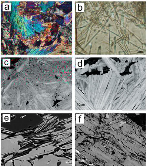 Thin section and back-scattered electron (BSE) images of the secondary amphibole in Isadalu magmatic rocks: (a,b) PLM images (crossed and parallel polarizers) of secondary amphibole pseudomorphosis; (c,d) BSE images showing geometry and morphology of secondary amphiboles; (e,f) BSE images of secondary amphibole with frayed ends showing acicular to fibrous aggregates morphology.