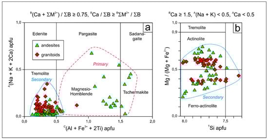 Proxy diagrams for amphibole classification [88,89,90], (a) calcium amphiboles and their compositional boundaries, and (b) classification diagram for amphiboles belonging to tremolite-actinolite serie.