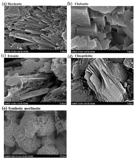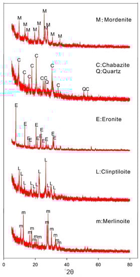 Different natural zeolites often grow together or coexist with other minerals; hence, the identification of zeolite composition is imperative. The natural zeolites that were used in this study include chabazites and erionites from Arizona, USA; clinoptilolites acquired from China; and mordenites from Japan. Furthermore, we deliberately synthesized pure merlinoite to manually create a zeolite composition with a lower Si/Al ratio than those of natural zeolites. The synthetic method was designed based on our previous studies by employing glass materials [,]. The five samples were identified by X-ray Diffraction (XRD, MAC, Science Mxp 3, Yokohama, Japan) using a Cu target with the Cu Kα wavelength through a 1° divergent slit. Operating conditions were established as 45 kV and 40 mA, the scanning step size was 0.0083556°/s, and a step of 1.27 s was used in the 2θ range of 3°–80°. Mineral identifications by XRD are shown in Figure 1. Most of the zeolites were very pure, and only the chabazite contained a small amount (~5%) of quartz.