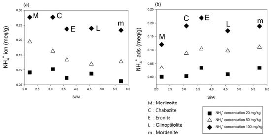 Figure 3a presents the relationship between the ammonium ion exchange capacity and the Si/Al ratio of zeolites under initial NH4+ concentrations of 20, 50, and 100 mg/kg. The trend indicates that zeolites with lower Si/Al ratios (merlinoite, chabazite) have slightly higher ion exchange capacities (NH4+ion). This may be somewhat influenced by the more exchangeable IA and IIA cations in zeolites with lower Si/Al ratio [,]. On the other hand, the adsorption capacity of a zeolite is primarily controlled by the zeolite structure. Therefore, we calculated the ammonium adsorption capacity and then compared it with the zeolite Si/Al ratio (Figure 3b). We discovered that zeolites with higher Si/Al ratios have slightly higher ammonium adsorption capacities (NH4+ads), but that of erionite is especially higher. Leyva-Ramos et al. [,] compared the ion exchange capacities of chabazite and clinoptilolite and also reported that natural chabazite has a higher ion exchange capacity, which is similar to our result shown in Figure 3a.