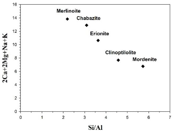 Each zeolite possesses a different structure and composition. Theoretically, the number of exchangeable cations in a zeolite will influence its ion exchange capacity, and the channel pore size of a zeolite will impact its adsorption capacity. The pore sizes and numbers of channels in zeolites are somewhat dependent on the Si/Al ratio []. Substitution of silicon by aluminum atoms in the crystal framework leads to additional negative charge, requiring balancing by IA and IIA cations (e.g., Na+, K+, Ca2+, and Mg2+) []. Therefore, we must compare the cation numbers and Si/Al ratios of zeolites with their ammonium removal ability.