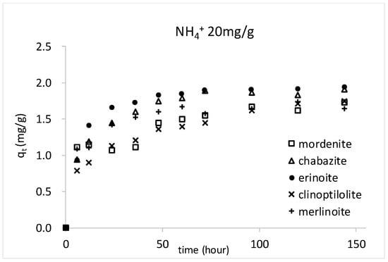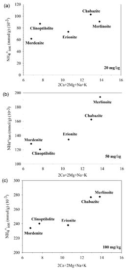 As shown in Table 2, when we changed the ammonium concentration, we observed that the proportions of ion exchange and adsorption capacities for each zeolite were altered. In the 20 mg/kg ammonium solution, most zeolites have higher ion exchange capacities, and more than 90% of ammonium removal is dependent on the ion exchange mechanism. Only mordenite and erionite show lower than 70% ammonium removal by ion exchange. The results of Table 2 imply that a higher ammonium concentration leads to a higher proportion of adsorption by zeolites. The percentage of ion exchange capacity ranges between 64% and 99% at an initial concentration of 20 mg/kg, and it declines to 54–85% at a higher concentration of 50 mg/kg. In the highest ammonium concentration of 100 mg/kg, this percentage decreases to 52–70%. This phenomenon has also been proven in other studies []. Comparing the ammonium removal capacity of clinoptilolite between ours and that found by Liu et al. [] under the same conditions for 100 mg/kg, we found that the total ammonium removal capacity for their clinoptilolite mixed with heulandite and quartz was approximately 0.3 meq/g and the ion exchange capacity was approximately 0.2 meq/g []; in this study, the total ammonium removal capacity of our zeolites is higher than 0.4 meq/g, and the ion exchange capacity is higher than 0.2 meq/g (Table 2).