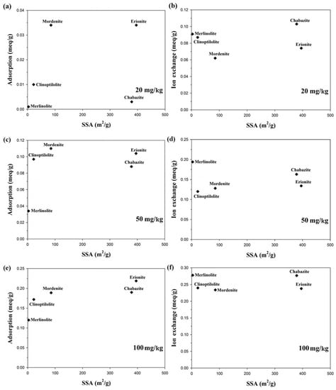 SSA reveals no relationship with ion exchange capacity in any concentration (Figure 6b,d,f). The SSA results from Figure 6a,c,e show that higher-SSA zeolites (i.e., erionite, chabazite, mordenite, and clinoptilolite) have higher adsorption capacity than synthetic merlinoite, especially at high concentrations of 50 mg/kg and 100 mg/kg (Figure 6c,e), with a nonlinear relationship. Up to 100 m2/g, the adsorption capacity exhibits an obviously positive trend with the SSA. Interestingly, however, as the SSA rises above the critical value of 100 m2/g, the adsorption capacity no longer increases. This implies that the adsorption capacity has become saturated.