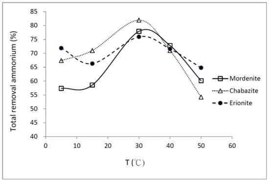 In order to examine the effect of temperature on zeolite ammonium removal, we selected three of the more effective ammonium-adsorbing zeolites (i.e., mordenite, chabazite, and erionite) to immerse in 50 mg/kg NH4+ solution at 5, 15, 30, 40, and 50 °C. We calculated the percentage of total NH4+ removal under these different temperatures (Figure 7). This experiment revealed that the percentage of NH4+ removal reaches its highest level at 30 °C for these zeolites. The percentages of NH4+ removal were 77.91% for mordenite, 81.96% for chabazite, and 75.94% for erionite at 30 °C. However, when the temperature is higher or lower than 30 °C, the ammonium removal ability decreases rapidly. This result agrees well with previous research [,,,,,], which also demonstrated that the highest ammonium removal efficiency occurs at room temperature (25–35 °C). At low temperatures of 5 and 15 °C, chabazite and erionite have better removal abilities than mordenite (Figure 7). It is very interesting that the ammonium removal ability of mordenite shows an extreme decrease as the temperature reaches values lower than 20 °C. We know the rate of ion exchange should decrease as the temperature drops and the adsorption ability should decrease as the temperature goes up.