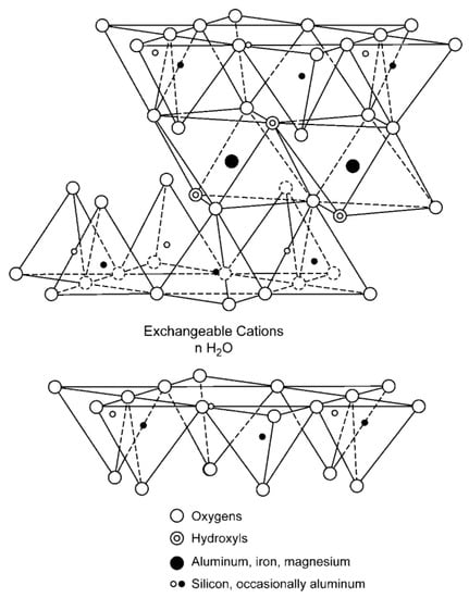 - Odom, I.E. Smectite clay minerals: Properties and uses. Philos. Trans. R. Soc. A 1984, 311, 391–409. [Google Scholar] [CrossRef]