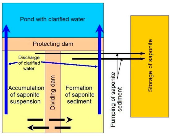 Figure 3 presents the general layout of a tailing pond with cryogenic treatment [1,35]. It can be seen that beyond the main pond and the protecting dam is located a pond of clarified water. After saponite sedimentation, the water flows through a drainage installation in the bottom part of the main tailing pond to the clarified water pond, where it accumulates for reverse water supply. The tailing pond is divided into two sections by a dam. One section receives the pulp and accumulates the saponite suspension; the other is used for freezing of suspension in winter and draining of thawed out water during the summers. The freezing-defrosting process promotes the sedimentation of saponite, which is extracted from the pond, pumped, and stored in a specially arranged storage representing depressions in natural relief. After being emptied, this section of the tailing pond is ready to be filled with the pulp again, while the accumulated suspension will be freezing in the other section. The cycle is repeated so that every year the pond sections change places.