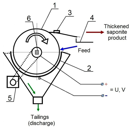 In works [36,37,38,39,40], a reagent-free electrochemical method and implementation for saponite recovery from diamond-treatment plant process water is reported (Figure 4). The designed electrochemical separators accommodate the processes of electrophoretic extraction of saponite-containing product at the anode and osmic evolution of water at the cathode. The obtained concentrate (electrochemically modified saponite) is characterized by high contents of solids (up to 620 g/dm3 of suspension) and saponite and montmorillonite (more than 74.5%) and low quartz and dolomite contents (less than 12% and 5%, respectively), compared to the initial saponite-containing product (60–68%, 14–20%, and 6–10%, respectively). Owing to its chemical composition (SiO2, Al2O3, CaO, Fe2O3, FeO, TiO2, Na2O, K2O, SO3 etc. as main components), denser packing, high content of smectite group minerals and the presence of exchangeable cations, the modified saponite-containing product can be used in the manufacturing of quality building materials and sorbents [41].