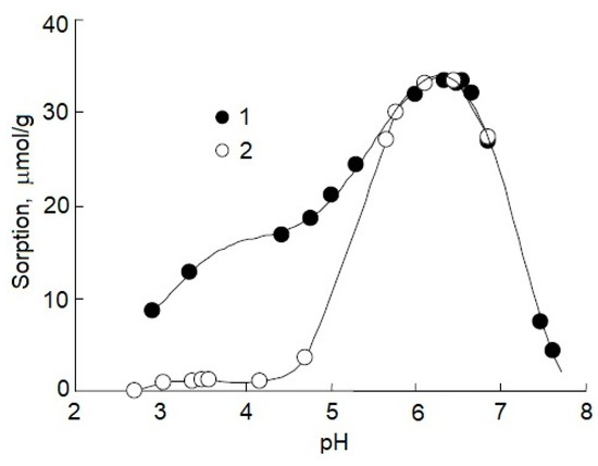 Work [66] has demonstrated that the saponite-based sorption technique can be applied in purification of uranium-contaminated water (over 90%). Equilibrium in the U6+–saponite system was found to be established within 8 h. The saponite–pH relationship has a clear maximum at pH 5–7 (Figure 5). The isotherm of U6+ sorption on saponite is described by the Langmuir empirical equation. The sorption process was shown to be affected by complexing reagents (ethylenediaminetetraacetic acid–EDTA, carbonate ions and fulvic acids).