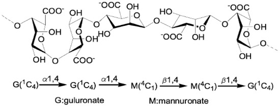 Seaweed glue molecular structure (monomer subunits, G—polyguluronic, M—polymannuronate) [20]. Reproduced with permission from Treenate et al., In vitro drug release profiles of pH-sensitive hydro-xyethylacryl chitosan/sodium alginate hydrogels using paracetamol as a soluble model drug; published by Elsevier, 2017.