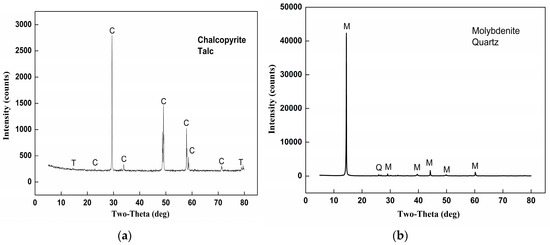 Pure chalcopyrite and molybdenite samples were all obtained from Anhui Mining Corporation, China. XRD results of the pure minerals are shown in Figure 2. According to chemical analysis and XRD results, the purity of chalcopyrite was 94.6% and the purity of molybdenite was 99.5%. Hand-selected crystals of these minerals were crushed to −1 mm by a laboratory roll crusher. The crushed products were then ground in a ceramic ball mill and dry-sieved to obtain the −75 + 38 μm-size fractions for micro-flotation tests (0.37 kW operating power and per 2 min as grinding frequency). A size fraction of −38 μm particles was further ground to −2 μm for adsorption and zeta potential measurements as well as FT-IR studies. Pure mineral samples were stored in a vacuum-desiccator after preparation and washed in an ultrasonic bath for 5 min to remove potential oxidation film before each use. Atmospheric oxidation of chalcopyrite (ageing) produces compounds such as iron–oxyhydroxides and basic iron–sulphates on the chalcopyrite surface [21,22]. The oxidation of molybdenite mainly occurred in the defect point of the cleavage surface, and produced compounds like MoO3 [23].