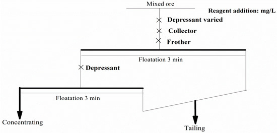 The following conditioning procedure was used for all flotation tests. The flotation tests were carried out in a XFG-1600-type flotation machine (Xinghai, Shandong, China). Pure mineral particles (3 g) were placed in a Plexiglas cell (40 mL), which was then filled with distilled water. The slurry pH was modified to the desired value by adding either HCl or NaOH solutions. Pulp pH was measured using a pH meter (PHS-3C). The reagents (SEG, AX, and MIBC) were added in sequence and conditioned for 2 min each. The operating conditions were set to 8 mm froth depth, 1900 rpm impeller speed, and 30 times per minute scraping frequency. The flotation was conducted for 5 min. The products were collected, dried, and weighed. For single mineral flotation, the flotation recovery was calculated based on the dry weight of the products obtained. For mixed minerals (the ratio of Cu and Mo was 3:1) flotation, the flotation recovery was calculated based on Cu and Mo grade between the concentrates and tailings. The flow sheet and conditions of flotation tests are demonstrated in Figure 3. Both the concentrate and tailing were filtered, dried, and weighed. Concentrate (Cu) and tailing (Mo) were analyzed.