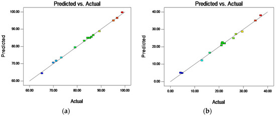 Design expert plot of (a) chalcopyrite and (b) molybdenite: Actual values versus predicted response by Box–Behnken design (BBD).