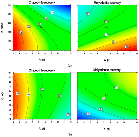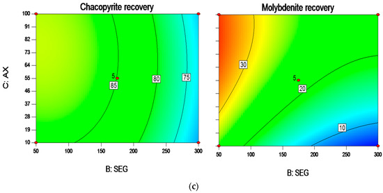 Figure 5c shows the corresponding contour of the combined effect of dosage of AX and SEG, whilst pH was maintained at 3.4 (natural). It was proved that the recoveries of molybdenite increased with the increase in SEG concentration, while it basically had no influence on chalcopyrite flotation. Furthermore, the result also showed that the recovery difference between chalcopyrite and molybdenite was decreased gradually as the AX concentration was increased.