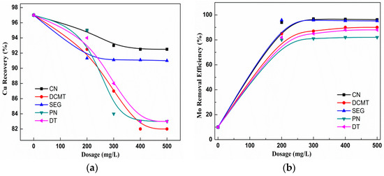 The effects of various depressants on the Mo removal efficiency and Cu recovery are shown in Figure 6. As seen in Figure 6, as the depressant concentration increased, the removal efficiency of Mo increased, and only a small effect on Cu recovery was observed. It could be seen that the removal efficiency of molybdenite presented similar trends, while using different depressants. Initially, the removal efficiency of molybdenite gradually increased with the increase of depressant concentration; however, the removal efficiency increased slowly when the depressant was increased to a certain concentration. The results indicated that the Cu recovery was affected by the higher concentration of depressant, which may be explained by the fact that strong adsorption had a negative effect on chalcopyrite flotation. Taking Mo removal efficiency and Cu recovery into consideration, the optimal concentration was 200 mg/L with SEG as depressant. All five of the depressants showed an excellent selectivity for the separation of molybdenite and chalcopyrite.