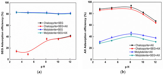The adsorption behaviors of SEG and AX on chalcopyrite and molybdenite surfaces as a function of pH are given in Figure 7. It was proved that the adsorption efficiency of SEG on molybdenite was obviously higher than chalcopyrite, even though the adsorption capacity of chalcopyrite increased with increases of pH value. Satisfactory results for the adsorption efficiency of SEG on chalcopyrite and molybdenite surface were about 83% and 10%, respectively, when pH was less than 5. This may be related to the formation of hydrophilic metal hydroxides on the surface of chalcopyrite, especially in alkaline condition [34]. The contrast in adsorption efficiency changes of these minerals shows that the treatment of AX has little influence on the interactions between SEG and these minerals.