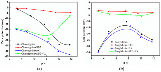 Zeta-potential of (a) chalcopyrite and (b) molybdenite in the absence and presence of SEG and AX under different pH conditions (SEG: 197 mg/L, AX: 16 mg/L).