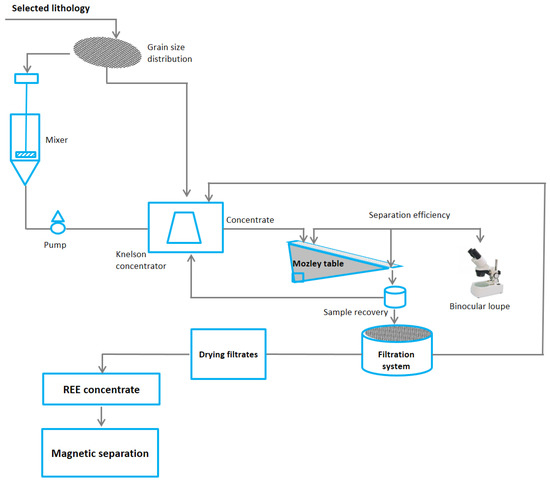 Due to their high density and magnetic properties, REE-bearing minerals were enriched using gravity and magnetic separation. Ferro-carbonatite high grade (FeC-HG) was used as feed for the enrichment process. The material was dried and sieved into four different fractions (−106 µm, −315/+106 µm, −630/+315 µm, and −2 mm/+630 µm) to determine the REE distribution. The fractions were selected on the basis of the grain size distribution curve of the whole material to provide equivalent weight fractions. The heavier minerals appeared to be concentrated within the finest fraction, i.e., below 106 µm with 46,275 ppm LREE (La, 16,767 ppm; Ce, 27,504 ppm; Pr, 2009 ppm). Slurry composed of water and solids (around 40% solids) corresponding to each size fraction was prepared in the mixing tank before feeding the concentration process steps. Several stages of concentration using a Knelson concentrator and Mozley table were necessary to improve the grade of the concentrate (Figure 2). The final concentrate was created by mixing concentrates with the same initial proportions (raw sample FeC-HG). The separation efficiency was first verified through binocular loupe and then submitted to physical, chemical, and mineralogical characterization.