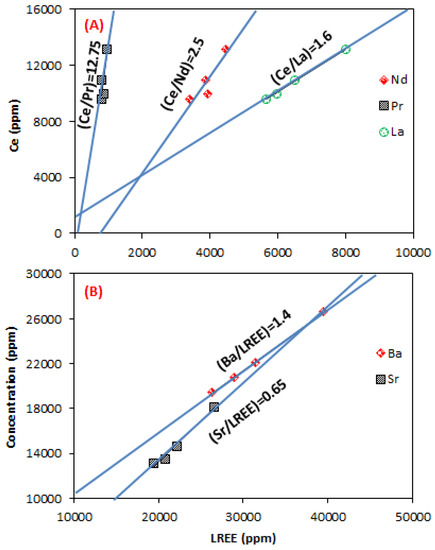 Correlation between LREE (Ce vs. La, R2 = 0.99; Ce vs. Nd, R2 = 0.93; Ce vs. Pr, R2 = 0.91) (A), LREE vs. Ba (R2 = 0.99) and LREE vs. Sr (R2 = 0.98) (B).