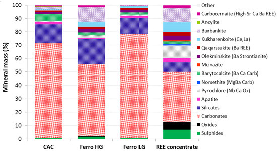 These XRD results are confirmed by the other mineralogical techniques. SEM-EDS and QEMSCAN investigation show that: (i) REE are partially or totally liberated as free particles (kukharenkoite, burbankite, qaqarssukite, monazite) and/or associated with pyrochlore, baytocalcite, apatite, and Mg-Fe carbonates (Figure 4); (ii) all analyzed REE-bearing minerals contain LREE (La, Ce, Pr, Nd, Sm); (iii) two groups of REE-bearing minerals (carbonates and phosphates) were detected with variable REE grades; and (iv) pyrite and pyrrhotite were the most abundant sulfide minerals identified in the sample.