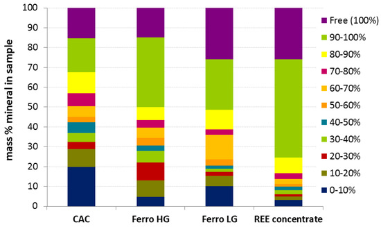 The QEMSCAN results shown in Figure 5 demonstrate that the concentration process successfully increased the grades of all REE-bearing phases, and decreased those of the non REE-bearing gangue minerals (carbonates and silicates). The degree of liberation of REE-bearing minerals is very important because it allows evaluation of mineral absolute reactivity. Liberation (based on area %) data is shown for combined REE minerals. At least, 50% of the REE-bearing minerals are liberated (more than 15% as free particles) within the samples, while the remaining particles are either included or locked within gangue minerals (e.g., silicates and carbonates) (Figure 6).