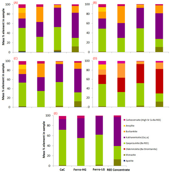 Ce (A), La (B), Pr (C), Nd (D), and Sm (E) deportment in REE-bearing minerals.