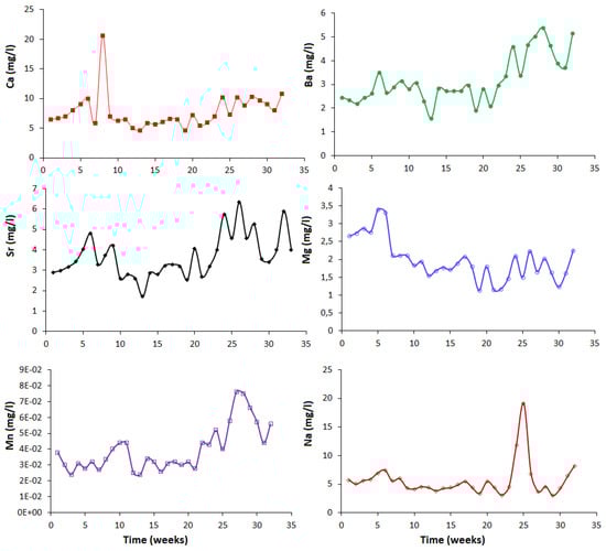 Evolution of Ca, Ba, Sr, Mg, Mn and Na concentrations from weathering cell test.