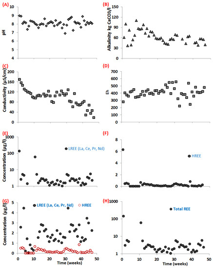 The weathering cell test results are shown in Figure 8 and Figure 9. The pH of all the cell leachates remains alkaline (7.27–8.95) during the test. The electric conductivities of the leachates stabilize rapidly between 117 and 169 µS/cm. The redox potential (Eh) varied from 228 to 553 mV. The alkalinity values stabilize between 37 and 110 mg CaCO3/L, while the acidity is always below 5 mg CaCO3/L. All these parameters stabilize after the approximately the first 60 days. The leaching concentrations of Th, Nb, Ni, Pb and Cu are not presented due to their low concentrations in the leachates from the REE concentrate. It is worth mentioning that these elemental concentrations were below the values fixed by Directive 019 (provincial legislations in Quebec). Leachate Ca concentrations vary between 0.003 and 20.6 mg/L after approximately 287 days. The Ba concentrations increase from the beginning of the test until approximately 231 days, after which they decrease until the end of the test and remain below the analytical detection limit (0.001 mg/L). The Sr (1.71–8.24 mg/L) and Mn (0.009–0.076 mg/L) concentrations generated from the concentrate sample show similar trends. The REE concentrate cell also generates detectable Mg and Si concentrations in the leachates (Mg: 0.05–3.4 mg/L and Na: 0.004–19.1 mg/L). The As, Cd, Bi, Co, Cr, Fe, Th, Ti and Zn values are typically under their respective detection limits and are therefore not shown.