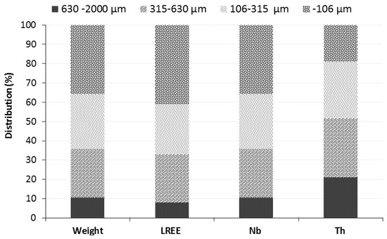 The chemical composition of the concentrate analyzed by XRF are shown in Table 3. In general, LREE concentrations increase with decreasing particle size. Sulfide minerals and iron oxides are also concentrated in the finest size fraction of the concentrate sample. The Nb, and Th display a similar trend (Figure 10). The majority of these elements are present in the −106 µm fraction (41% of LREE, 36% of Nb, and 19% of Th). The concentration of LREE in the finer fractions is explained by preferential grinding of REE-bearing minerals compared to the gangue minerals (i.e., silicates, iron oxides, etc.).