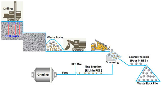 In the light of these findings, and in the framework of sustainable development, social acceptability, and environmental regulations of REE mine wastes, the finer fraction will be the most problematic fraction and will potentially require a focused strategy to mitigate the risk. Fine particles are the most reactive to water-rock interactions due to its higher specific surface area and degree of liberation. Therefore, they may release metals, REE, and other contaminants in the drainage waters, which might exceed regulatory limits. As a circumvention strategy, and in the context of sound REE production, this fraction could be separated by a screening operation and reprocessed with the ore (Figure 11). The least problematic coarse fraction could be sent to waste rock piles with suitable and specific environmental management and waste disposal strategies.