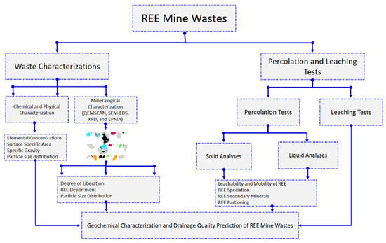 Predicting the geochemical behavior of REE-bearing mine wastes and, ultimately, the mine drainage quality of those wastes, is not significantly different than for other metals. However, prediction of contaminated neutral drainage issued from REE mine wastes is particularly challenging because of the low reactivity and complex compositions of REE-bearing minerals. Therefore, in order to better understand the geochemical behavior of REE waste rocks and tailings and predict the quality of the drainage waters, the use of detailed chemical/mineralogical characterizations such as QEMSCAN, MLA, SEM and EPMA are necessary. Figure 12 illustrates a mine water quality prediction strategy that could be applied to REE-bearing mine wastes. The purpose of this approach is to meet the following challenges (Figure 12): (i) identify and quantify the different REE-bearing minerals (and associated potential contaminants) on representative samples of the different lithologies; (ii) evaluate the reactivity of the REE-bearing lithologies; (iii) propose an integrated management approach of the future REE-bearing waste rocks. In such an approach, representative samples of the different lithologies are submitted to percolation and leaching tests along with physical, chemical and mineralogical testing. The combination of these results helps to identify risks associated with weathering of mine waste and to move towards prediction of mine water quality.