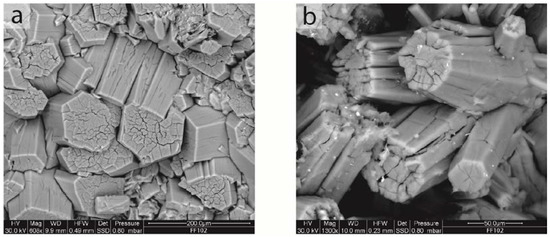 The FF102 sample contains stocky-prismatic crystals of offretite showing well-shaped hexagonal or pseudo-hexagonal habits with diameters of ~50 µm and lengths up to 200 µm (Figure 1a,b). They occur as irregular aggregates of several individual crystals, but isolated single prisms are also observed. In some cases, the crystals termination shows smaller size and irregular morphology due to the presence of a network of fractures. The crystals of this sample have a compact aspect and a rigid behavior and do not originate any fibrous element.