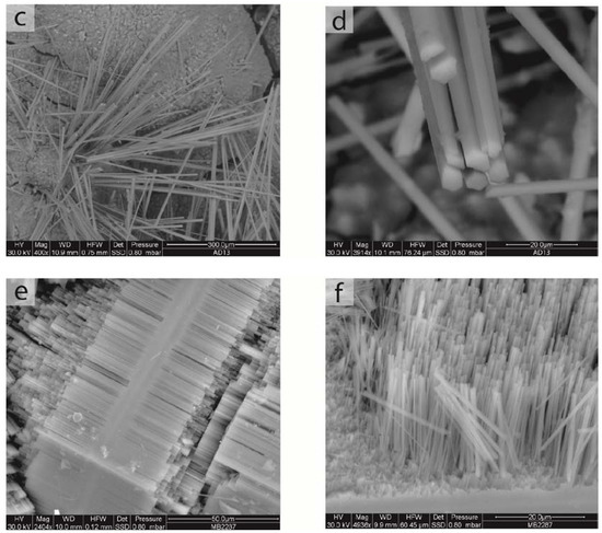 Representative SEM images of the studied samples. (a) Stocky-prismatic crystals of offretite with hexagonal section (FF102); (b) Radial aggregates of offretite prisms, characterized by evident fractures (FF102); (c) Very elongated, acicular to fibrous offretite crystals grouped in radial aggregates with rigid to flexible behavior (AD13); (d) Particular of the previous sample showing the thin diameter of hexagonal offretite fibrils (AD13); (e) The offretite–chabazite–offretite sequence is forming a sandwich-like morphology (MB2287); (f) Details of the parallel growth of the asbestiform offretite consisting of rigid to flexible thin fibers and fibrils (MB2287).