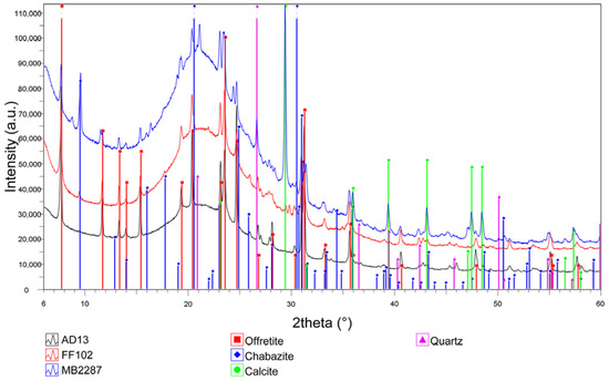 Owing to the difficulty of separate pure offretite crystals, XRPD data indicate that sample FF102 contains impurities of chabazite and calcite, whereas MB2287 has large amounts of chabazite and calcite and minor quartz plus additional clay minerals (Figure 3).