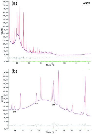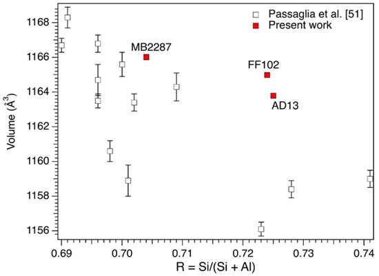 Refined cell parameters (Table 2) are similar among the samples and are consistent with those reported by [51]. Addition of the present data to the unit-cell volume vs. R (R = Si/(Si + Al)) plot of [51] does not improve the poor correlation reported by those authors (Figure 4).