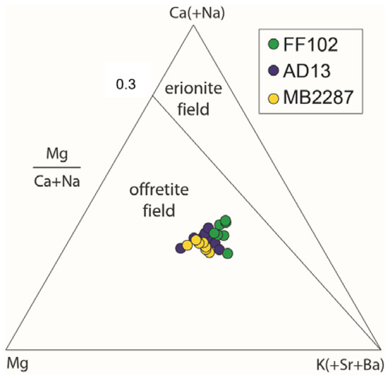 Ternary compositional plot [51] of the studied offretite samples, showing the distribution of extra-framework cations and the fields of erionite and offretite.