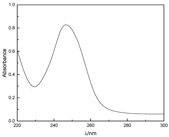 The adsorption of IPETC onto chalcopyrite and galena was measured by ultraviolet (UV-1810) spectrometer (Beijing Purkinje General Instrument Co., Ltd., Beijing, China). The pH range from 4 to 13 was determined by measuring the adsorption at wavelength 246 nm [], as shown in Figure 1. Two gram pure mineral of −38 µm was added into 40 mL deionized water, then NaOH or HCl was added to adjust pH. After the desired reagents were added in order and the conditioning time was identical with flotation test. Then, the pulp was centrifuged for 10 min using a high-speed refrigerated centrifuge at 9000 r/min. Later the supernatant was filtered, the solution after adsorption was measured by the UV spectrometer, and the adsorption of IPETC on the mineral surface was calculated from the difference in the concentration of initial and residual ITEPC in the solution as the following equation: