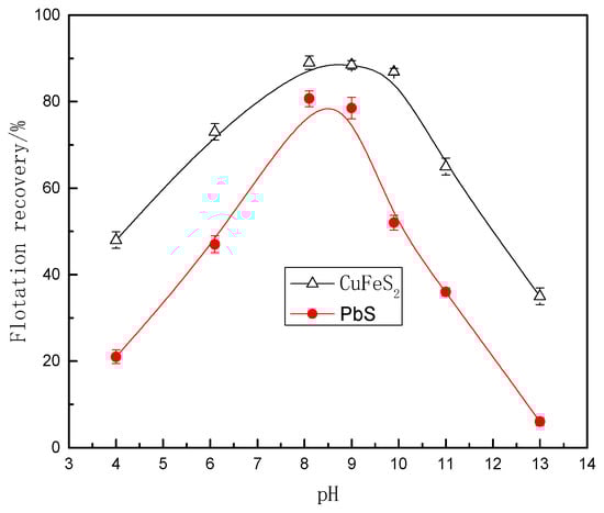 Recoveries of chalcopyrite and galena as a function of pH (IPETC: 8 × 10−4 mol/L).