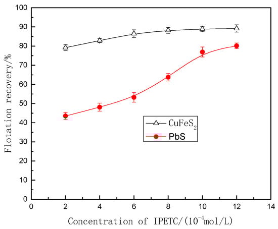 The results of pure mineral flotation tests show that IPETC has excellent performance in separating galena from chalcopyrite at a pH 9.5. Figure 3 shows the recovery-IPETC dosage curves of chalcopyrite and galena, and it can be seen that with the increase of IPETC dosage from 2 × 10−4 mol/L to 12 × 10−4 mol/L, the flotation recoveries of the two mineral increase, with the recovery of galena growing faster, especially as dosage over 7 × 10−4 mol/L.