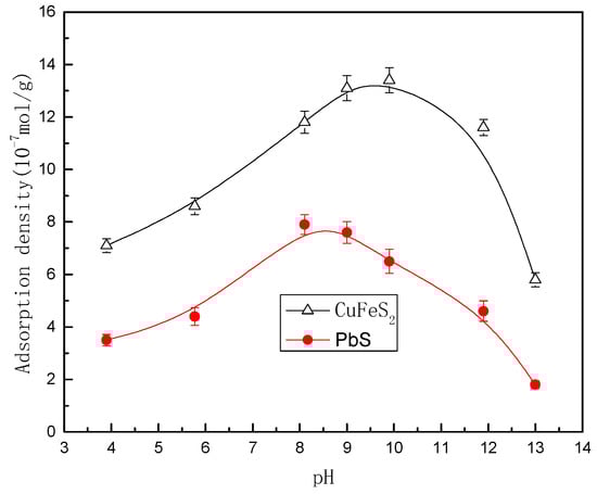 The adsorption density of IPETC on the surfaces of both chalcopyrite and galena as a function of pH was investigated. Figure 4 shows the adsorption density of IPETC (7 × 10−4 mol/L) onto chalcopyrite and galena. It can be seen that with the increase of pH from 4 to 13, the adsorption density of IPETC onto both two minerals increases at the beginning and then decreases, and the adsorption density onto galena is always lower than that onto chalcopyrite. The adsorption density of IPETC onto both minerals decreases rapidly when pH is greater than 10. The larger the adsorption density onto the minerals is, the higher recovery of mineral will be. OH− has an effect on the adsorption of IPETC, especially when the pH is high, and OH− can inhibit IPETC adsorption clearly.