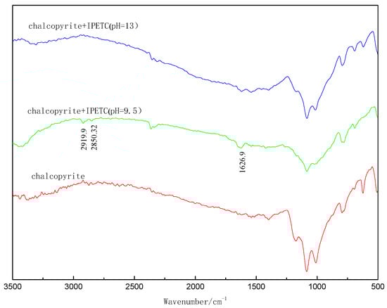 FTIR spectra of chalcopyrite, galena and both minerals conditioned with IPETC (7 × 10−4 mol/L) at pH 9.5 and 13 are given in Figure 5 and Figure 6. The spectrum obtained at pH 9.5 shows characteristic absorption bands of –C=N (stretching vibration) at 1267 cm−1 appearing both on chalcopyrite and galena surfaces []. The asymmetrical bending vibration of –CH3 and scissor rocking vibration of –CH2 appear on chalcopyrite at 2850 and 2920 cm−1 [], and on galena at 2854 and 2925 cm−1 []. Comparing with the two peaks of IPETC at 2877 and 2978 cm−1 [], redshift occurs significantly on both minerals. The bands shift on chalcopyrite is 5 cm−1 more than galena, and the bond energy of IPETC and chalcopyrite is greater. The peak –C=N indicates that IPETC mainly exists as C3H7OC (SH)=NC2H5 in an alkaline environment. These peaks mean IPETC adsorbs onto both the surface of chalcopyrite and galena. The spectrum obtained at pH 13 shows there are no peaks or shift appearing on two minerals, indicating that the adsorption of IPETC is dominated by nonspecific adsorption.