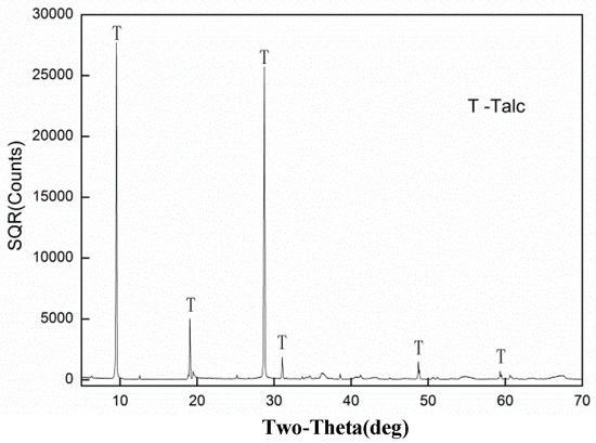 Pure talc samples were obtained from Anhui Mining Corporation, China. The purity of the mineral sample was more than 90% by X-ray diffraction analysis and chemical analysis, as shown in Figure 1 and Table 1. The sample was shown to include the major ash elements S and C at 3.18% and 1.46%, respectively. Hand-selected crystals of these minerals were crushed to −1 mm in a laboratory roll crusher. The crushed products were then ground in a ceramic ball mill and the product was screened into three narrow size fractions: −74 + 38, −38, and −10 µm. It is noted that the size fraction of −10 μm was received in the settlement of hydraulic and the solid mass concentration is 16.6% (sedimentation time, 26 min 12 s) [26]. The size distribution of narrow size fractions is given in Figure 2 and summarized in Table 2.